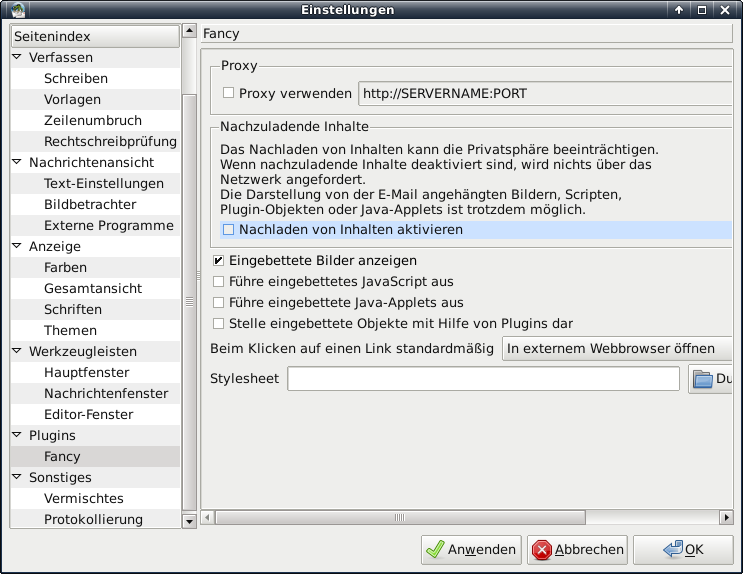 Für Claws-Mail gibt es eine Reihe nützlicher Plugins. Neben dem PDF-Viewer verwende ich das Fancy-Plugin zum Rendern der HTML-Mails, die ich haufenweise von Kollegen bekomme. Das ist ein Kompromiss, den ich für tragbar halte, weil beim Rendern standardmäßig keine Inhalte aus dem Internet geladen werden. Wenn ich eine HTML-Mail als sicher erachte, kann ich sie natürlich auch mit Internetzugriff rendern. Ich habe mich gegen den Dillo HTML Viewer entschieden, weil er nur aus den Backports verfügbar ist und - soweit ich das nach einem kurzen Test einschätze - keine für mich wichtigen Vorteile gegenüber Dillo bietet.