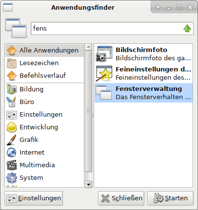 Auch bei der Bedienung müssen wir eingreifen. In der Standardkonfiguration funktioniert nicht einmal die Windows-Logo-Taste, um das Startmenü aufzuklappen und mit Wortsuche Programme zu starten. Bis ich später das mächtigere Whisker-Menü aktiviert habe, starte ich Programme am einfachsten über den Anwendungsfinder mit der Tastenkombination ALT+F3. Das folgende Bild zeigt den Anwendungsfinder, in dem gerade die Fensterverwaltung ausgewählt wurde. Es genügt, die Anfangsbuchstaben des Programms einzutippen.