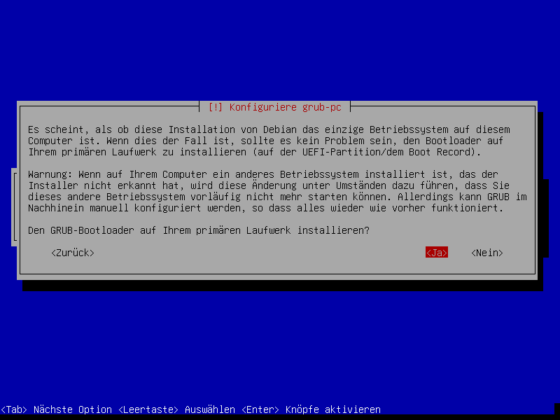 Nach der Installation wird man gefragt, wohin der Bootloader GRUB installiert werden soll. In der Regel ist hier ist der MBR von /dev/sda die richtige Wahl.