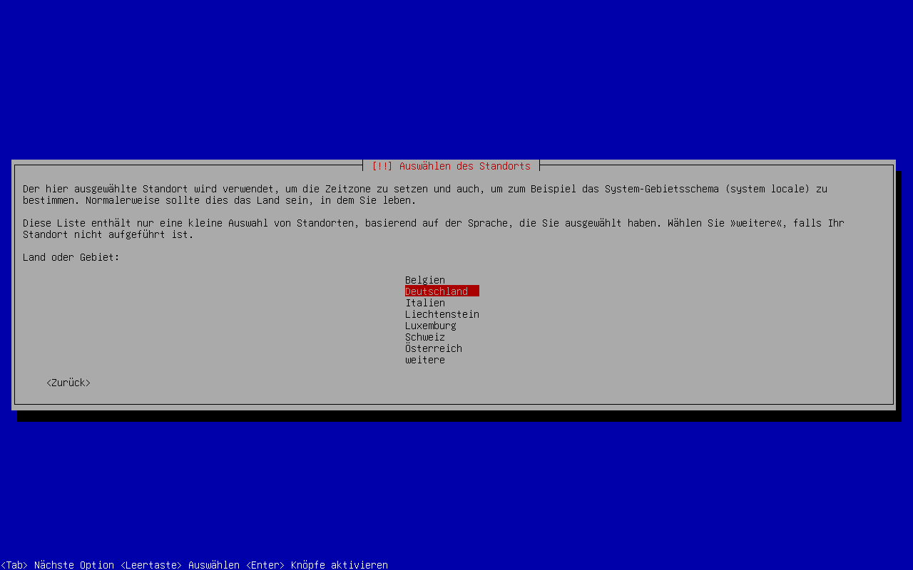 Während der Installation müssen neben der verwendeten Sprache auch Angaben zu Standort und Tastaturlayout gemacht werden. Unter Linux ist es üblich, dass die Hardware-Uhr auf koordinierte Weltzeit eingestellt ist. Der Standort legt dabei fest, welche Zonenzeit man angezeigt bekommt. Die Wahl der Sprache beeinflusst die Wahlmöglichkeiten für den Standort. Es werden nur Standorte vorgeschlagen, zu denen es auch ein Gebietsschema in der zuvor gewählten Sprache gibt. Die nachfolgende Wahl des Tastaturlayouts ist beliebig.