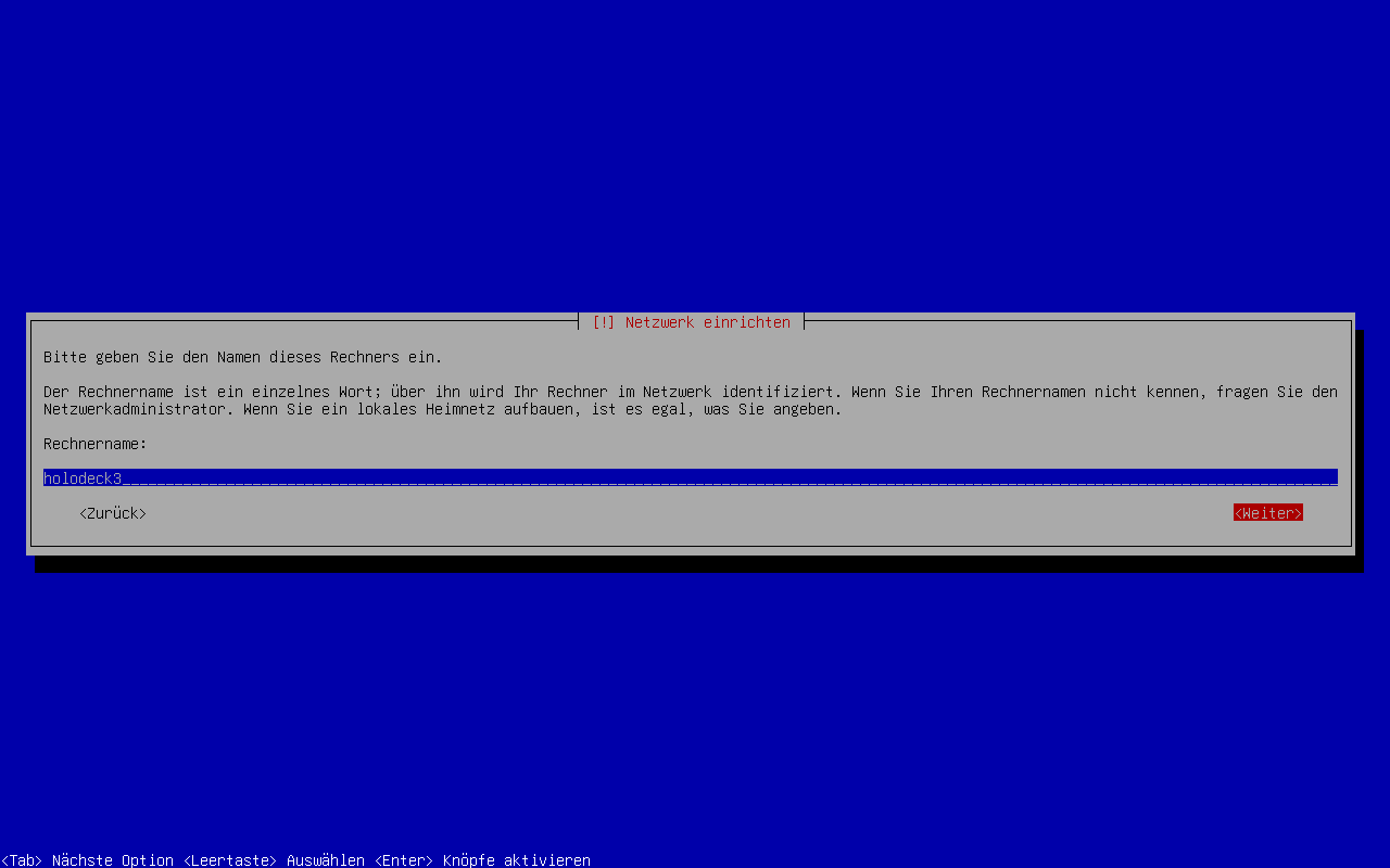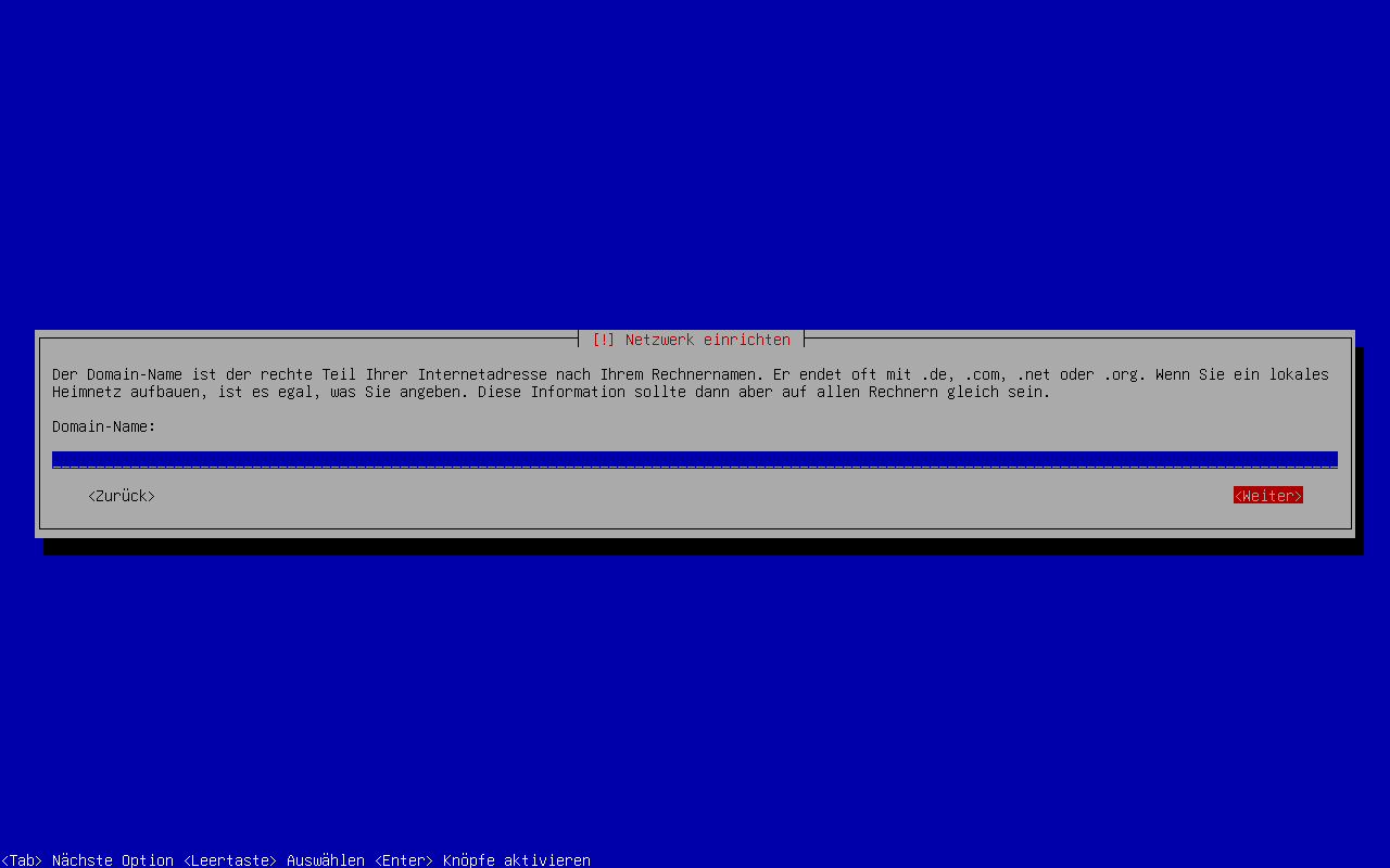 Nach der automatischen Netzwerkkonfiguration per DHCP muss man einen Rechnernamen angeben. Im Netzwerk sorgt meine Fritz!Box dafür, dass der Rechner anstelle mit der IP-Adresse auch unter diesem Namen adressiert werden kann. Der Name wird auch in der Kommandozeile angezeigt und bei mir außerdem noch auf dem Loginbildschirm. Üblicherweise benenne ich meine Rechner nach astronomischen oder mythologischen Objekten, neuerdings auch nach literarischen Vorbildern. Den Domain-Namen habe ich immer leer gelassen. Ich denke, das ist nur für Server mit direkter Internetanbindung wichtig.