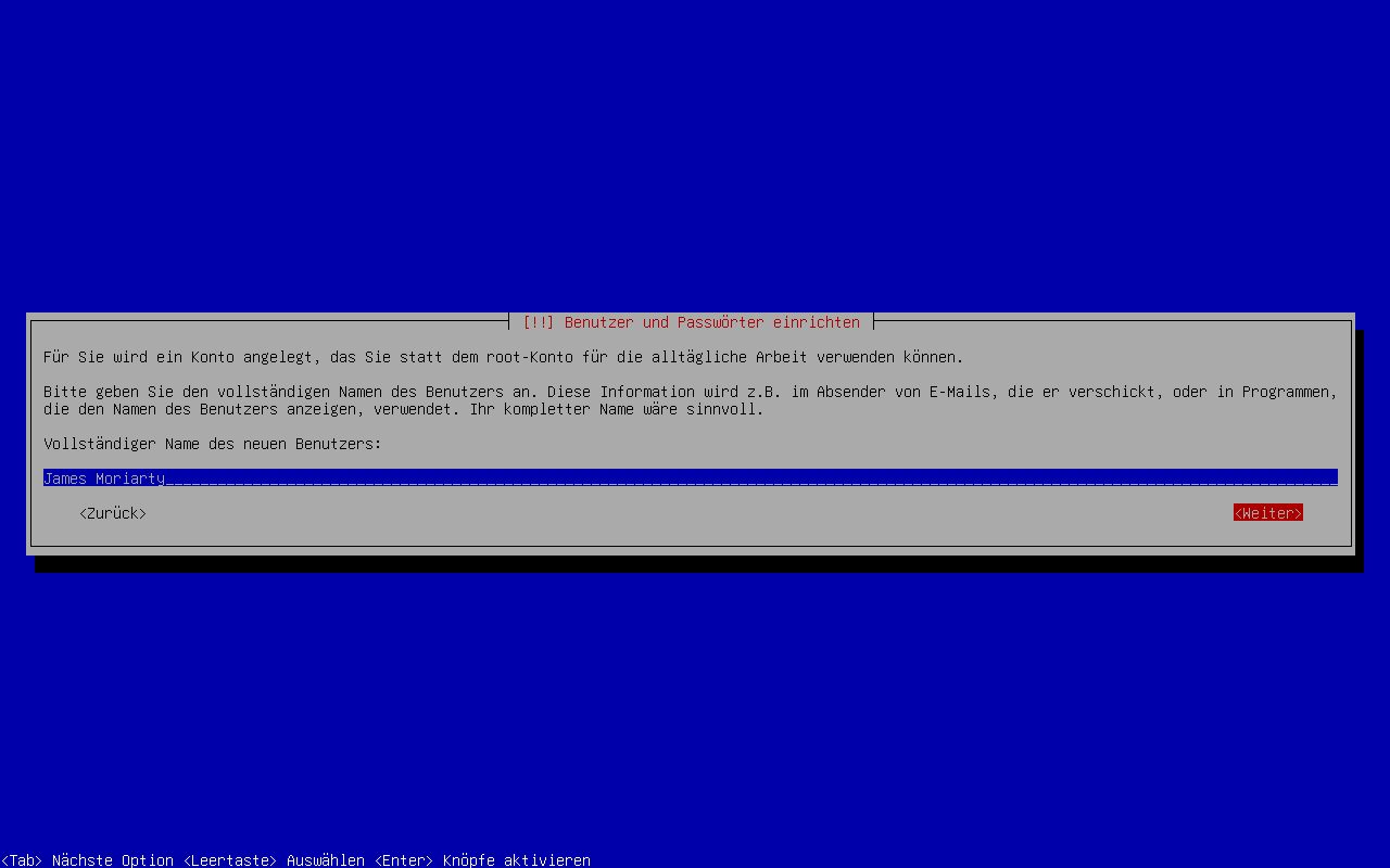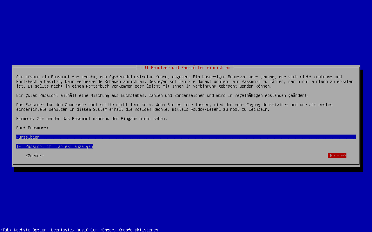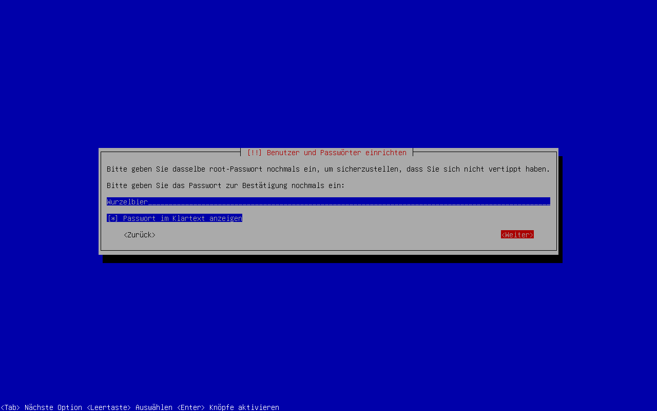 Anders als es unter Windows lange Zeit üblich war (und vielleicht noch ist?), verwendet man unter Linux für seine alltägliche Interaktion mit dem Rechner ein Nutzerkonto ohne Administratorprivilegien. Debian ist eine Distribution mit separatem Konto für den Systemadministrator. Dementsprechend wird neben dem Nutzerkennwort auch ein Administratorkennwort vergeben. Jedes Passwort muss zur Vermeidung von Tippfehlern zweimal eingegeben werden. Die hier gezeigten Beispiele sind natürlich keine von mir verwendeten Passwörter ;-) Erst recht sind es keine starken Passwörter.