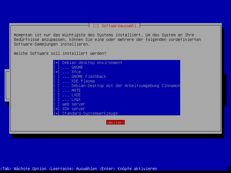 Wenn es um die Softwareauswahl geht, nehme ich meist an der Paketverwedungserfassung teil. Danach wähle ich neben den Voreinstellungen immer die Desktop-Umgebung XFCE und den SSH-Server hinzu. Gnome wähle ich ab.