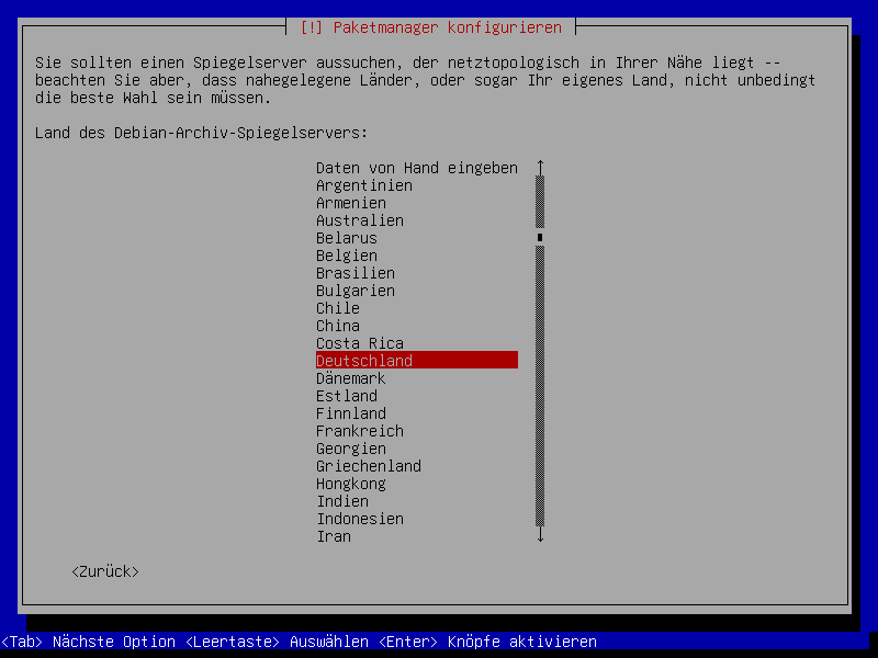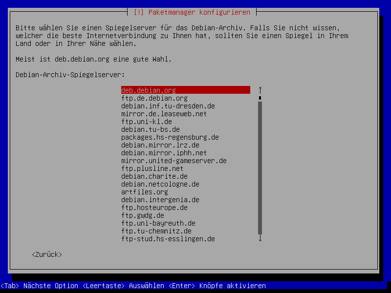 Um die eigentliche Installation zu beginnen, müssen noch Angaben zur Installationsquelle gemacht werden. Hier lässt man am besten die Standardeinstellungen. Ich installiere also von einem Deutschen Spiegelserver und wähle danach deb.debian.org. Eine Installation via HTTP-Proxy habe ich noch nie gemacht.