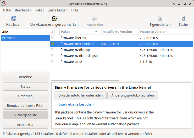Mit Außnahme von firmware-misc-nonfree sind bei mir immer alle benötigten Firmwarepakete vorinstalliert. Meine erste Maßnahme als Administrator ist also die Installation von firmware-linux-nonfree mit Synaptic.