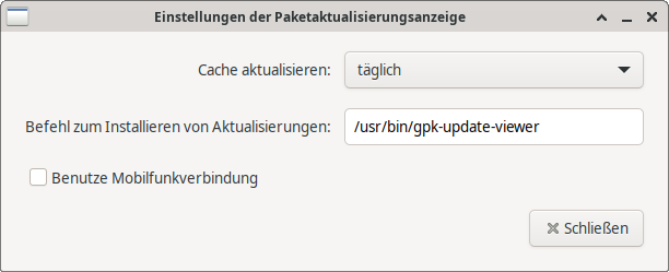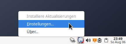 Nach der Installation und einem erneutem Login erscheint bei jedem Benutzer in der Benachrichtigungsfläche ein kleiner Globus. Mit einem Rechtsklick darauf gelangt man in die "Preferences". Dort kann man einstellen, wie oft nach Updates gesucht wird und man kann einen Befehl eingeben, der nach Klick auf "Install update" ausgeführt wird. Ich lasse die Standardeinstellungen bestehen. Wenn Updates zur Verfügung stehen, färbt sich das Symbol je nach Dringlichkeit gelb oder rot und es wird eine Benachrichtigung auf dem Desktop ausgegeben.