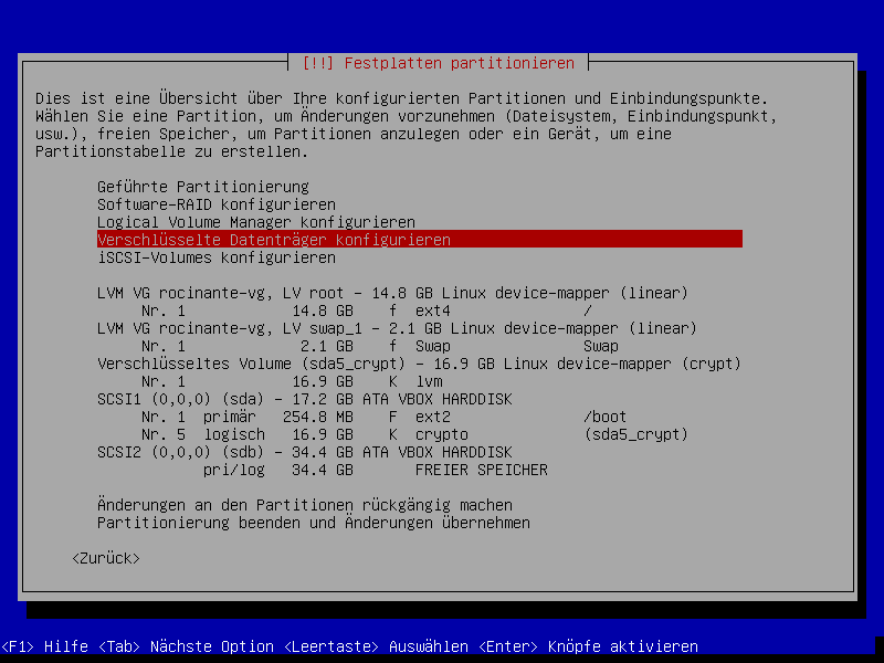 Sämtliche Datenträger auf allen meinen Rechnern werden bei der Installation mit LUKS verschlüsselt, einschließlich der SWAP-Partition. Beim Systemstart möchte ich aber nur einmal ein Kennwort eingeben müssen. Am bequemsten erreiche ich das durch eine Partitionierung der gesamten Festplatte mit einem verschlüsselten LVM.