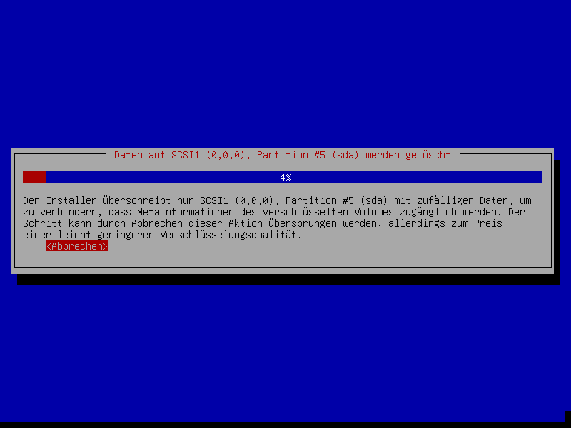Zum vorläufigen Abschluss der Partitionierung beginnt der Installer, die LUKS-Partition mit Zufallszahlen zu überschreiben. Ich nehme mir immer die Zeit, diesen Vorgang abzuwarten und arbeite derweil woanders weiter. Man kann den Vorgang aber auch Überspringen, da er wirklich sehr lange dauert. Bei der anschließenden Vergabe des Kennwortes bevorzuge ich lange Sätze, die ich mir gut merken kann, wobei ich einige Worte durch Leetspeak verfremde.