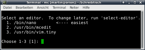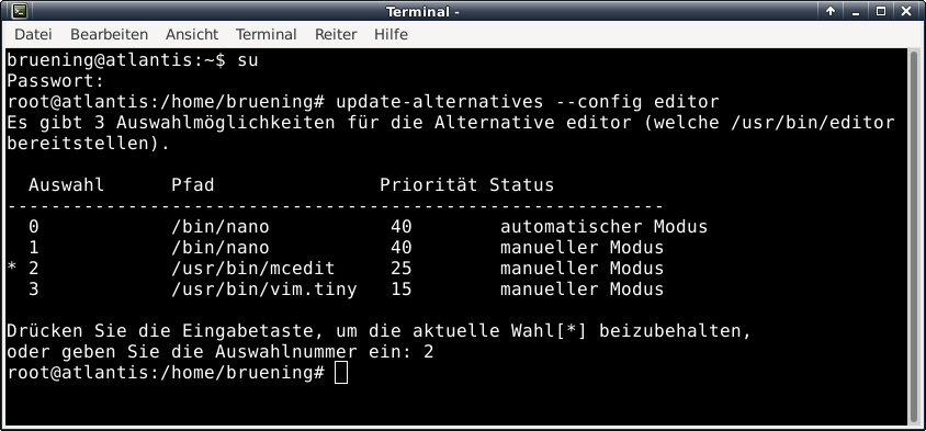 Anschließend kann man den bevorzugten Editor auswählen, indem man die Nummer tippt und mit Enter bestätigt.