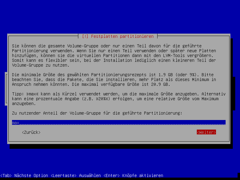 Nachdem die LUKS-Partition frisch mit Zufallszahlen tapeziert ist, darf man entscheiden, wie viel Platz man vom LVM nutzen möchte - alles natürlich! Dazu schreibt man "max" oder 100% in die Eingabemaske. Danach sieht man den Vorschlag für die Partitionierung, den man übernehmen oder überarbeiten kann.