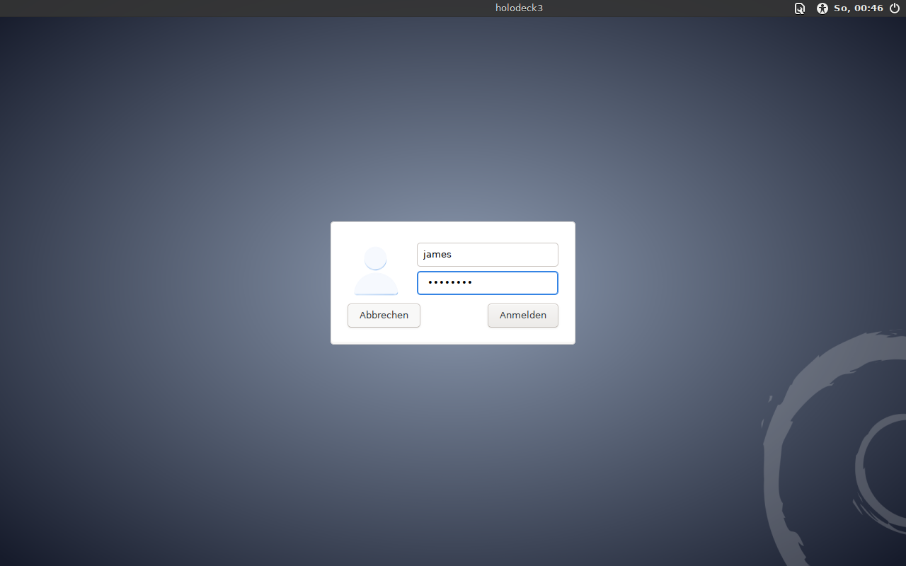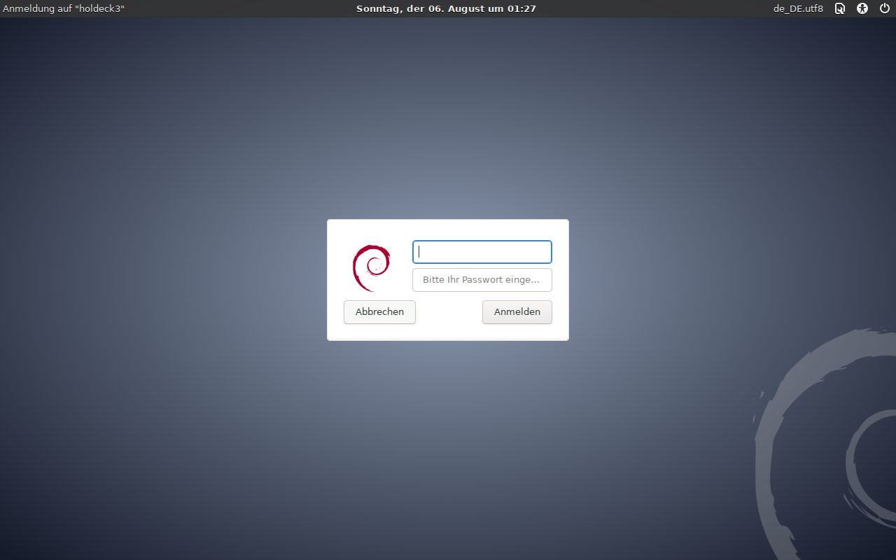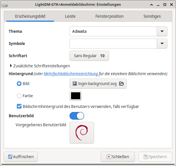 Ich habe die Gewohnheit, den Anmeldebildschirm noch leicht anzupassen. Dazu installiere ich das Paket lightdm-gtk-greeter-settings. Mit Debian 10 habe ich beim Erscheinungsbild anstelle des grauen Avatars erstmals das rote Debian Logo gewählt. Man findet es in der Kategorie "Emblems". Das zweite Bildschirmfoto zeigt die Anpassungen an der Titelleiste am oberen Rand des Loginbildschirms. Man Beachte das Leerzeichen vor dem Wort "Anmeldung".