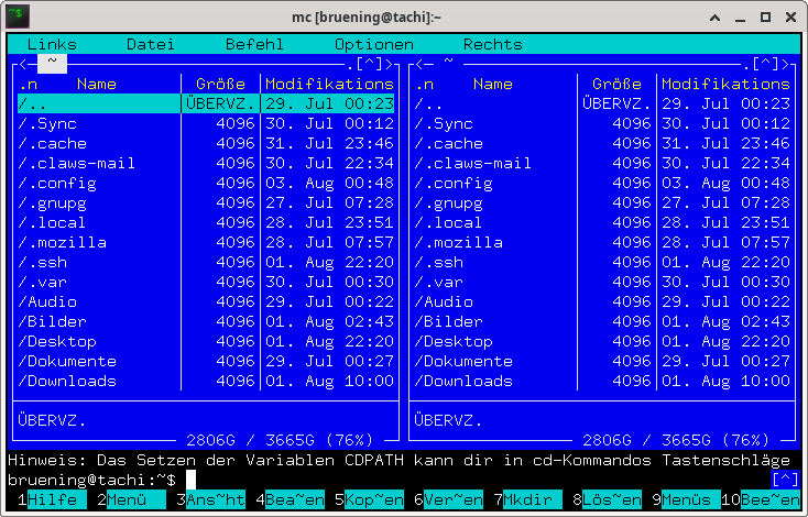 Von den zahlreichen Tastenkürzeln, die der Midnight Commander besitzt, halte ich ALT+i für das wichtigste. Es synchronisiert beide Spalten der Dateiansicht. Mit STRG+o kann man zwischen dem Dateimanager und der Kommandozeile wechseln, ohne sein Terminal zu verlassen. Einen symbolischen Link kann man mit STRG+x gefolgt von s anlegen.