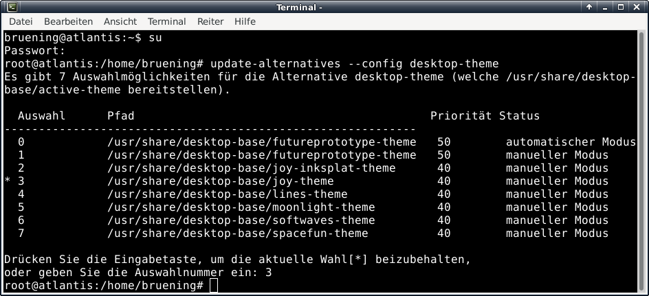 werden verfügbare Themes angezeigt. Auch hier steht das Designs "joy" zur Verfügung. Um es für Plymouth auszuwählen, lautet die Eingabe