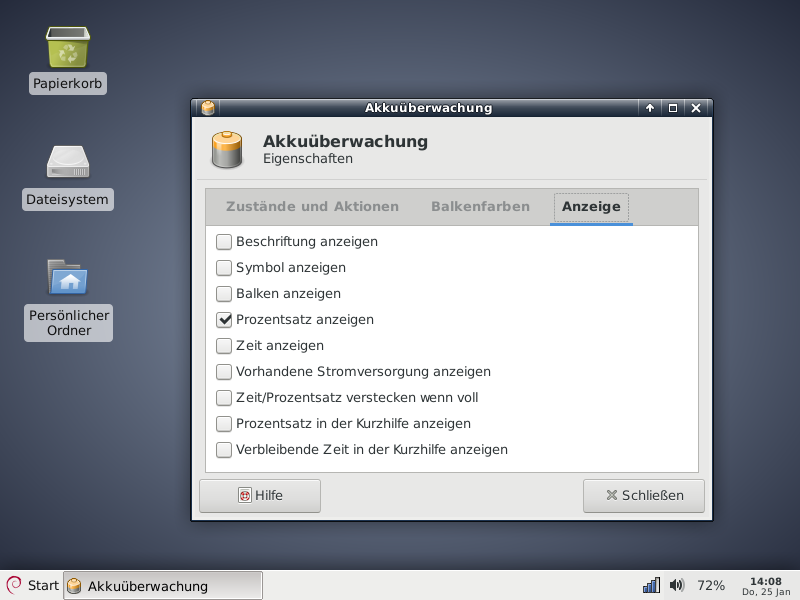 Ich ziehe die Akkuüberwachung der Energieverwaltungserweiterung vor, weil sie sich auf den Laptopakku beschränkt ist und die Möglichkeit bietet, bei bestimmten Ladeständen Shell-Befehle automatisiert ausführen zu lassen. Das folgende Bild zeigt den Desktop bei verringerter Auflösung und ausgeklapptem Startmenü.