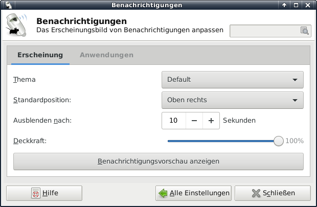 Die Desktop-Benachrichtigungen sind sinnvoll vorkonfiguriert. Die einzige Änderung ist, dass ich die Deckkraft auf 100% einstelle - kein Mensch braucht irgendwelche Transparenzeffekte.