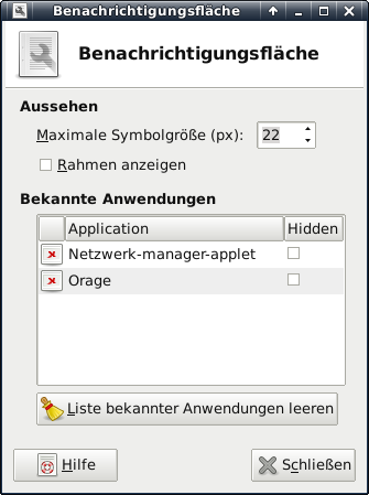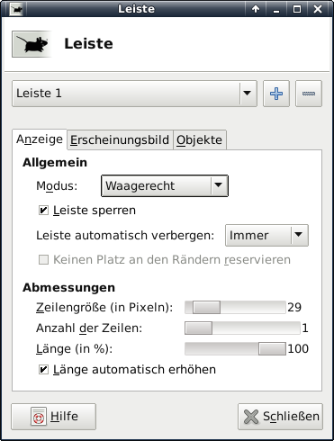 Die folgenden Abbildungen zeigen die Anzeigeeinstellungen der Leiste und die angedockten Objekte. Die Zeilenhöhe von 29 Pixel habe ich gewählt, weil das Symbol für das PulseAudio Plugin nicht stufenlos mitskaliert, sondern bei 30 Pixel diskret vergrößert wird, was mir nicht gefällt.