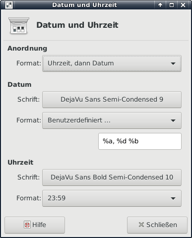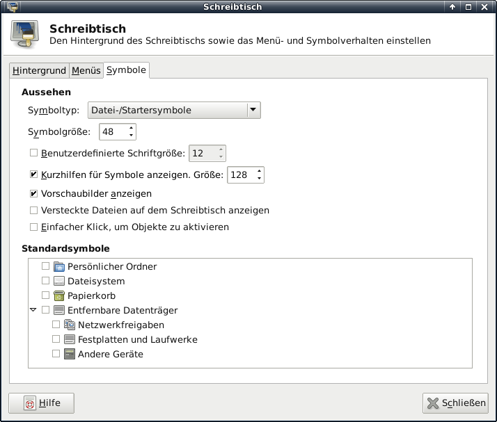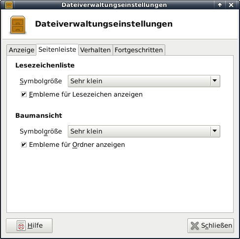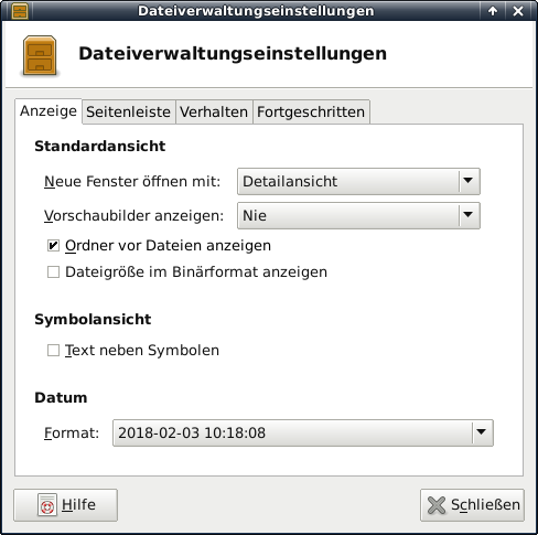 Die Dateiverwaltungseinstellungen beziehen sich auf den Dateimanager Thunar. Neue Fenster sollen in Detailansicht geöffnet werden. Auf Vorschaubilder verzichte ich, da diese nur in der Symbolansicht sinnvoll wären. Auch die Beschränkung auf Vorschau für lokale Dateien kommt nicht in Frage, weil ich entfernte Datenträger mit iSCSI wie lokale Massenspeicher einbinde. Für die Darstellung von Datum und Uhrzeit verwende ich grundsätzlich eine Schreibweise, bei der von links nach rechts die Zeitabschnitte kleiner werden. Das hat den Vorteil, dass die lexikografische Sortierung mit der chronologischen Sortierung zusammen fällt. In der Seitenleiste möchte ich Symbole maximal in Schriftgröße haben.