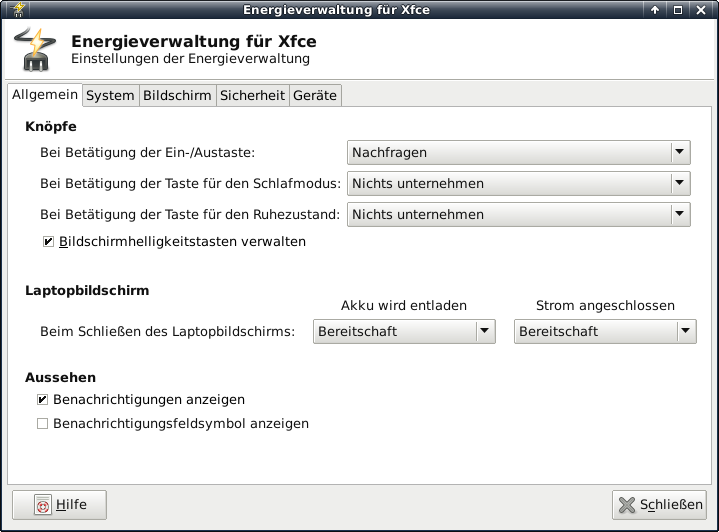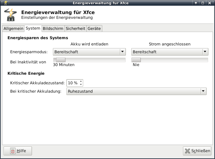 Ich will, dass mein Laptop beim Zuklappen in Bereitschaft geht und beim Aufwachen der Benutzer wieder authentifiziert werden muss. Allerdings neige ich dazu, am Schreibtisch in Gedanken zu versinken oder auch mal über längere Zeit nur analoge Medien einzusetzen. Dabei darf der Monitor ruhig in den Energiesparmodus versetzt werden. Wenn ich dann aber zu einem Punkt komme, wo ich mal schnell die Wikipedia brauche, ist es natürlich lästig, wenn der Rechner gesperrt ist. Ein automatisiertes Versetzen in Bereitschaft kann ich daher nicht brauchen. Lediglich bei kritischem Akkuladezustand von weniger als 10% erlaube ich ein automatisches Abschalten. In diesem Fall suspendiere ich den RAM, um Datenverlust zu vermeiden, falls ich keine Lademöglichkeit habe.
