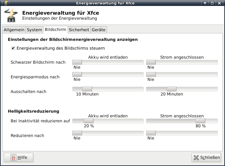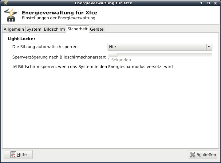 Ein schleichendes Abdunkeln des Bildschirms finde ich überflüssig. Ich lasse ihn im Akkubetrieb nach 10 Minuten ganz abschalten und im Netzbetrieb nach 20 Minuten. Ich lasse die Sitzung wie gesagt nicht automatisch sperren, möchte aber, dass das System beim Wechsel in den Bereitschaftsmodus gesperrt wird.