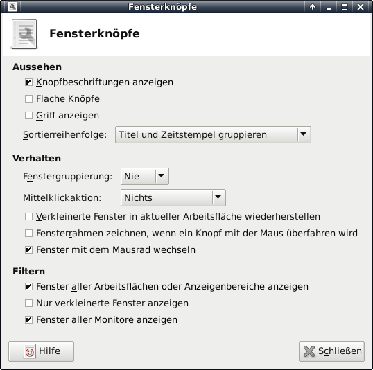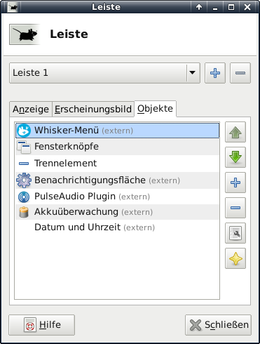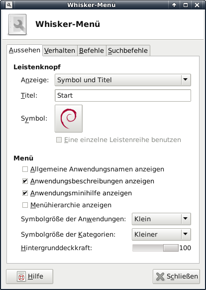 Wie man sieht, habe ich das normale Startmenü durch das Whisker-Menü ersetzt. Der Grund ist dessen einfache Suchfunktion per Tastatureingabe. Im Folgenden zeige ich die Konfiguration der einzelnen Leistenobjekte. Für das Whisker-Menü wähle ich das Debian-Logo und den Schriftzug "Start" - gehört für mich seit Windows 95 mit dazu. Bei den Fensterknöpfen entferne ich den Griff, von dem ich nicht weiß, wofür er da ist.