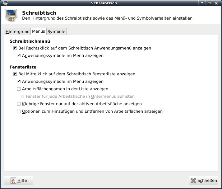 Im Desktop-Kontextmenü deaktiviere ich alle Optionen, die sich auf die Verwaltung von Arbeitsflächen beziehen, weil ich nur eine aktive Arbeitsfläche habe. Außerdem deaktiviere ich sämtliche Standardsymbole. Auf Laptops variiere ich je nach Bildschirmgroße und Auflösung die Schrift- und Symbolgröße.