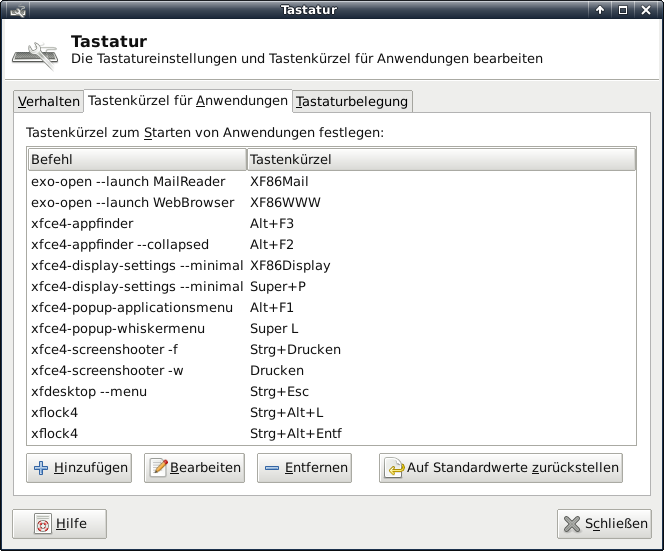 Für das Whisker-Menü kann man selbstverständlich ein Tastaturkürzel festlegen. Das geht in den Tastatur-Einstellungen. Im folgenden Fenster ist mit "Super L" einfach nur die Windowstaste gemeint. Außerdem lege ich noch Kürzel für die Erstellung von Bildschirmfotos an.