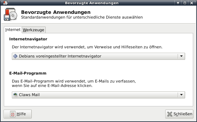 Bei den bevorzugten Anwendungen ist Claws Mail mein eMail-Programm. Thunderbird nutze ich nicht mehr, weil es zu viele Ressourcen benötigt und mit sehr vielen Mails im Postfach überfordert ist. Das Paket claws-mail muss zuvor noch installiert werden.