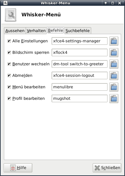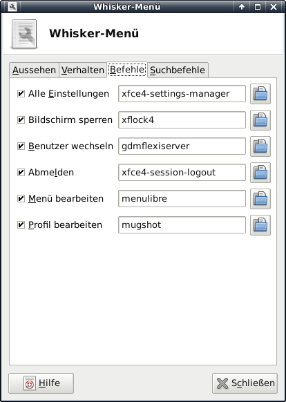 Mittlerweile dürfte aufgefallen sein, dass im Whisker-Menü das Symbol zum Benutzerwechsel ausgegraut ist. Der Grund ist, dass einige Pakete, die XFCE optional benutzt, nicht automatisch mit installiert werden. In diesem Fall fehlt der gdmflexiserver. In den Einstellungen des Whisker-Menüs hilft folgende Änderung.
