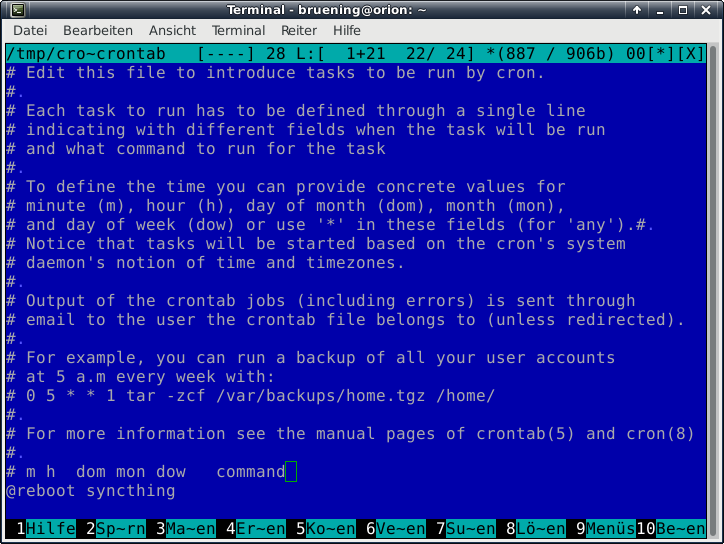 wird für den Benutzer eine Crontab angelegt und mit dem gewählten Standard-Texteditor bearbeitet. Man kann nun Befehle, die mit seinen Benutzerrechten zu einem vorgegebenen Termin ausgeführt werden sollen, eingetragen. In diesem Fall soll nach jedem Systemstart Syncthing gestartet werden. Dazu fügt man der Befehl