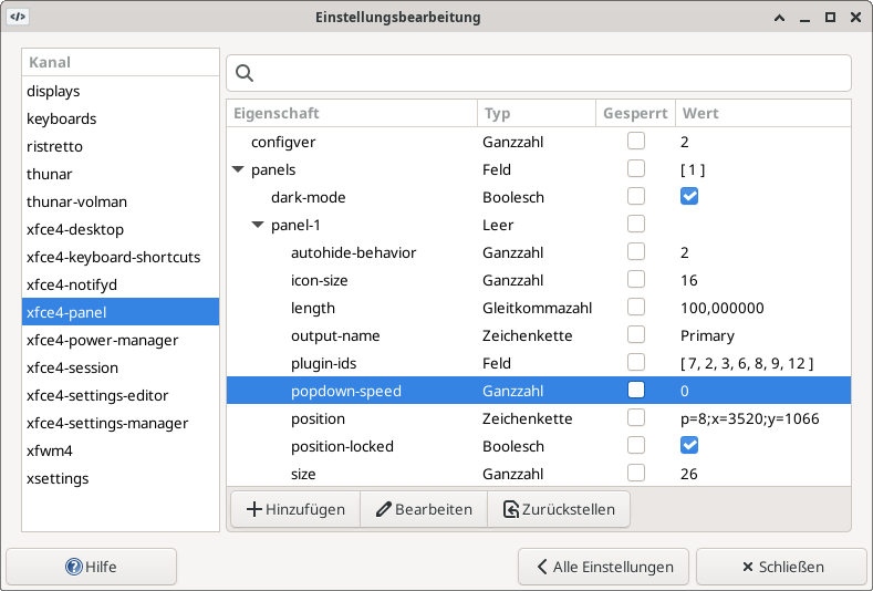 Zu jedem Panel den ganzzahligen Eintrag popdown-speed mit dem Wer 0 anlegen.